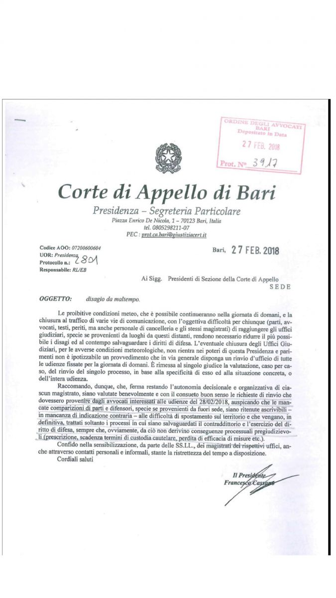 Emergenza meteo – Il provvedimento del Presidente della Corte d’Appello di Bari del 27-2-2018Ordine degli Avvocati27 Febbraio, 2018|Comunicati dalle Cancellerie - Uffici Giudiziari di Bari|Condividi questo contenutoFacebookXLinkedInWhatsAppEmail