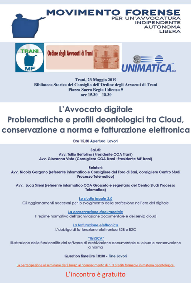 EVENTO FORMATIVO: L’avvocato digitale. Problematiche e profili deontologici tra Cloud, conservazione a norma e fatturazione elettronicaPer l'iscrizione con il sistemaOrdine degli Avvocati9 Maggio, 2019|Eventi formativi|Condividi questo contenutoFacebookXLinkedInWhatsAppEmail