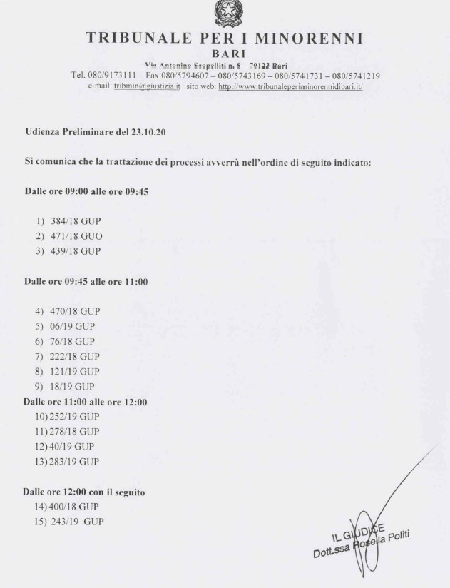 TRIBUNALE PER I MINORENNI DI BARI: UDIENZA DEL G.U.P. DOTT.SSA POLITI DEL 23 OTTOBRE 2020Ordine degli Avvocati17 Ottobre, 2020|Comunicati dalle Cancellerie - Uffici Giudiziari di Bari|Condividi questo contenutoFacebookXLinkedInWhatsAppEmail