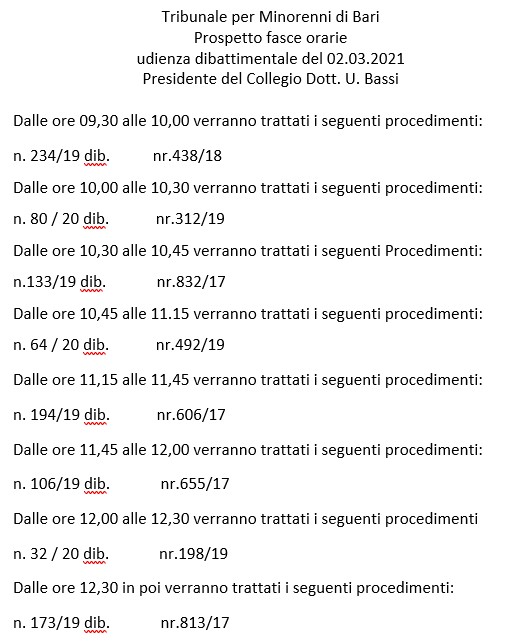 TRIBUNALE PER I MINORENNI DI BARI: UDIENZA DIBATTIMENTALE DEL 2 MARZO 2021, PRES. DOTT. BASSI – statino dell’udienzaOrdine degli Avvocati2021-02-24T21:20:59+01:0024 Febbraio, 2021|Comunicati dalle Cancellerie - Uffici Giudiziari di Bari|Condividi questo contenutoFacebookXLinkedInWhatsAppEmail