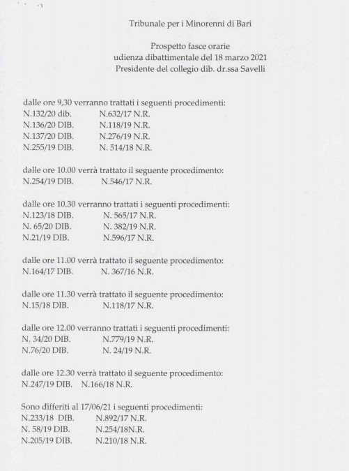 TRIBUNALE PER I MINORENNI DI BARI: UDIENZA DIBATTIMENTALE DEL 18 MARZO 2021, PRES. DOTT.SSA SAVELLI – statino dell’udienzaOrdine degli Avvocati2021-03-14T17:23:09+01:0014 Marzo, 2021|Comunicati dalle Cancellerie - Uffici Giudiziari di Bari|Condividi questo contenutoFacebookXLinkedInWhatsAppEmail