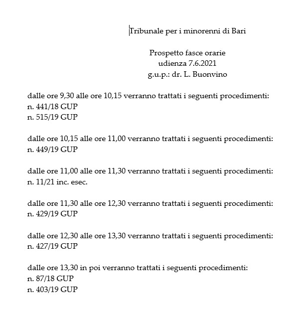 TRIBUNALE PER I MINORENNI DI BARI: UDIENZA DEL G.U.P. DOTT. BUONVINO DEL 7 GIUGNO 2021 – prospetto fasce orarieOrdine degli Avvocati2021-06-05T19:58:19+02:005 Giugno, 2021|Comunicati dalle Cancellerie - Uffici Giudiziari di Bari|Condividi questo contenutoFacebookXLinkedInWhatsAppEmail