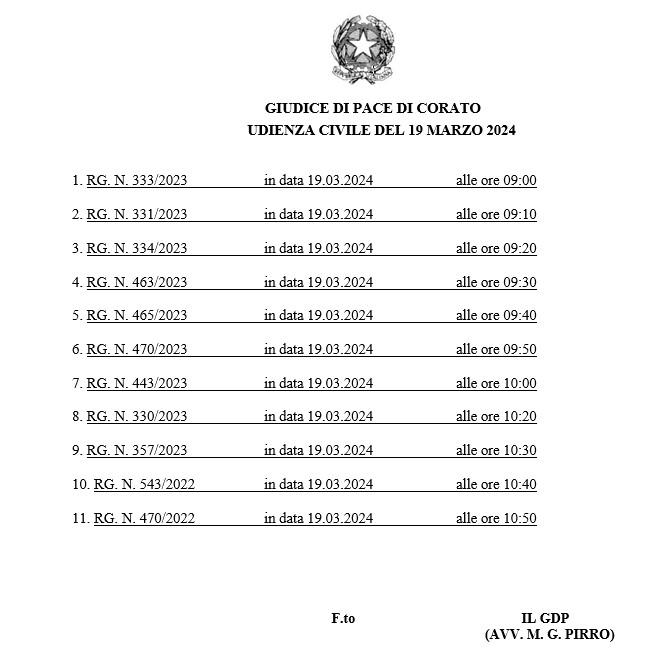 GIUDICE DI PACE DI CORATO: UDIENZA CIVILE DEL 19 MARZO 2024 AVV. PIRRO – ruolo dell’udienzaOrdine degli Avvocati2024-03-16T21:19:48+01:0016 Marzo, 2024|Comunicati dalle Cancellerie - Giudice di Pace di Corato|Condividi questo contenutoFacebookXLinkedInWhatsAppEmail