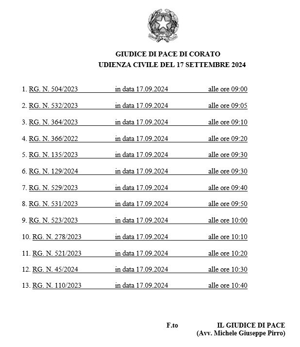GIUDICE DI PACE DI CORATO: UDIENZA CIVILE DEL 17 SETTEMBRE 2024 AVV. PIRRO – ruolo dell’udienzaOrdine degli Avvocati2024-09-15T17:49:34+02:0015 Settembre, 2024|Comunicati dalle Cancellerie - Giudice di Pace di Corato|Condividi questo contenutoFacebookXLinkedInWhatsAppEmail