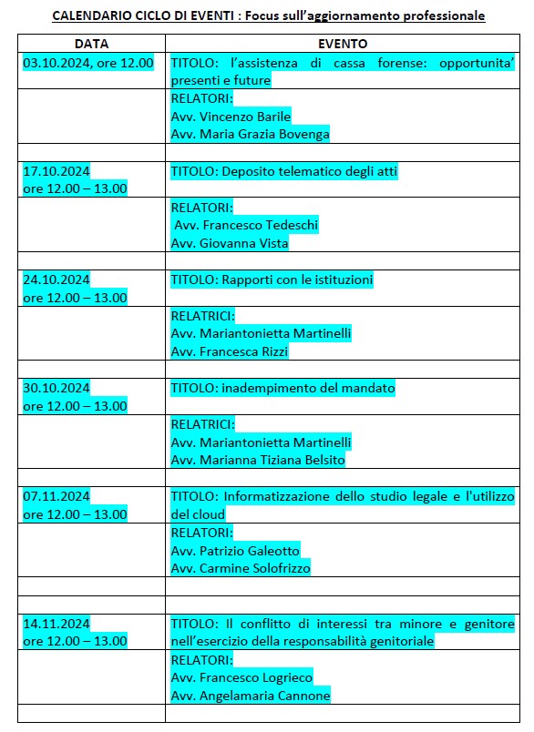 Si pubblica di seguito il calendario degli eventi formativi organizzati dalla C.O.A..