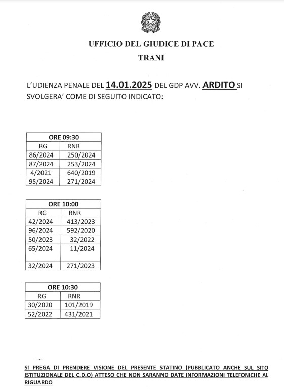 GIUDICE DI PACE DI TRANI: UDIENZA PENALE DEL 14 GENNAIO 2025 DOTT.SSA ARDITO – ruolo dell’udienzaOrdine degli Avvocati2025-01-08T09:15:55+01:008 Gennaio, 2025|Comunicati dalle Cancellerie - Giudice di Pace di Trani|Condividi questo contenutoFacebookXLinkedInWhatsAppEmail