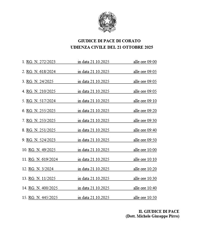 GIUDICE DI PACE DI CORATO: UDIENZA CIVILE DEL 21 OTTOBRE 2025 AVV. PIRRO – ruolo dell’udienzaOrdine degli Avvocati2025-10-20T13:06:43+02:0020 Ottobre, 2025|Comunicati dalle Cancellerie - Giudice di Pace di Corato|Condividi questo contenutoFacebookXLinkedInWhatsAppEmail