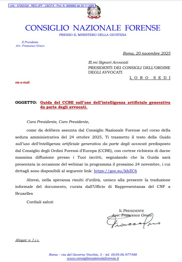 Si pubblica la comunicazione del Consiglio Nazionale Forense del 20.11.2025 relativa all’uso dell’intelligenza artificiale generativa di cui alla guida del 25.10.2025 del Consiglio degli Ordini Forensi d’Europa.