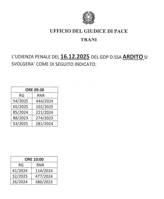 GIUDICE DI PACE DI TRANI: UDIENZA PENALE DEL 16 DICEMBRE 2025 DOTT.SSA ARDITO – ruolo dell’udienzaOrdine degli Avvocati2025-12-03T21:50:19+01:003 Dicembre, 2025|Comunicati dalle Cancellerie - Giudice di Pace di Trani|Condividi questo contenutoFacebookXLinkedInWhatsAppEmail